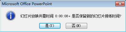 单击鼠标左键或按键盘上的空格键可以进入下一个幻灯片中,然后重新开始记录你在下一个幻灯片中排练演示了多长时间,直到最后结束的时候PowerPoint2007会提示“幻灯片放映共需时间 **。是否保留新的幻灯片排练时间?”(如下图)选择“是”,下次PPT自动播放时就会自动使用你这次保存的“排练时间”自动播放。