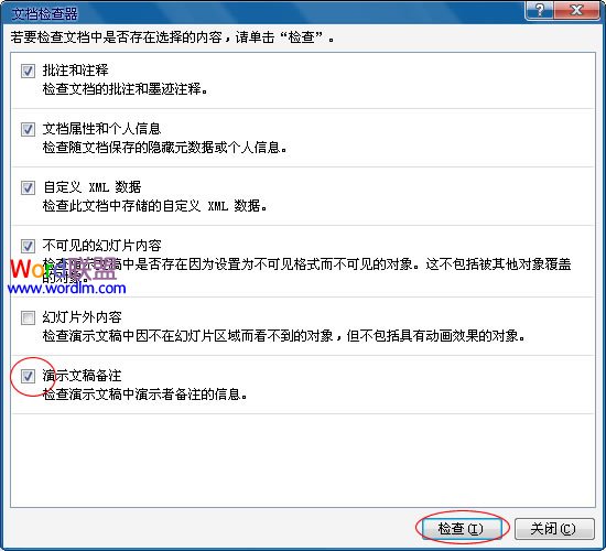 ②然后在弹出的“文档检查器”中勾选“演示文稿备注”(一般默认是勾选的);最后单击下面的“检查”按钮;