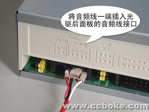 因为音频线是最容易插错的,为了避免这种情况的发生。大家可以仔细观察这根音频线,就可以在音频线接头的都会有一个箭头标示(一般是在白色那根线的位置),将其与光驱和声卡的音频线接口上标示的“L”相对应插入即可。