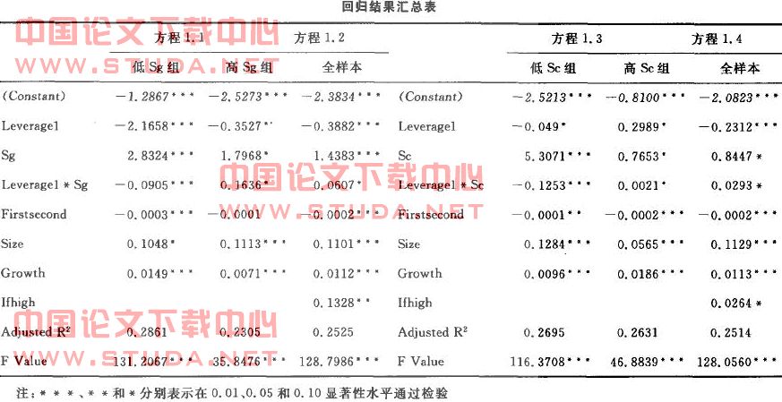 其中各变量符号的名称及其定义解释如下:资本结构(Leverage):总负债/总资产;公司业绩(Performance):每股收益(Eps);资源丰度(Sg):将行业销售收入与时间哑变量进行回归,再用回归系数除以行业收入的均值来加以计量。复杂性(Sc):先对行业中每一个企业所占的市场份额(单个企业的销售收入占整个行业的销售收入)加以平方,然后再将各项平方值加总。公司规模(Size):总资产的自然对数;公司成长性(Growth):净利润增长率;第一大股东控制权(Firstsecond):第一大股东持股比例/第二大股东持股比例;环境变化分组(Dummy):当公司所处行业变化稳定时,该虚拟变量取1,否则取0。